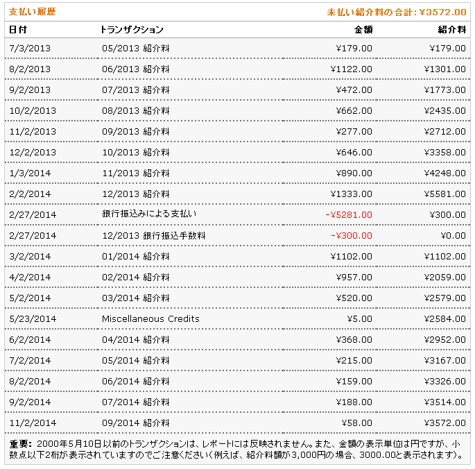 2014年2月28日にアマゾンより5281円を受け取りました。※システムを知らなかったので、気がつきませんでした。すみません。現在、未払い残高が3572円ですが、これが5000円以上になると自動で振り込まれるようになっているらしいです。(2014年12月2日)